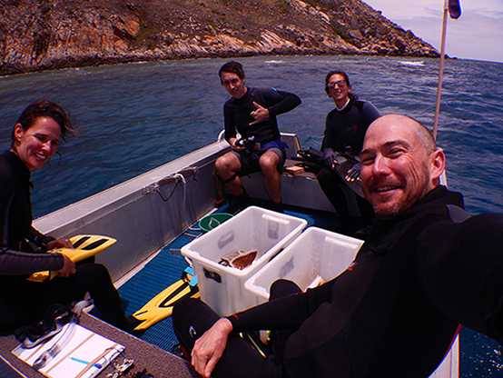 Maria and Viviana with collaborators Josh Madin and Oscar Pizarro getting ready to jump in the water, deploy settlement tiles and collect coral cover data.